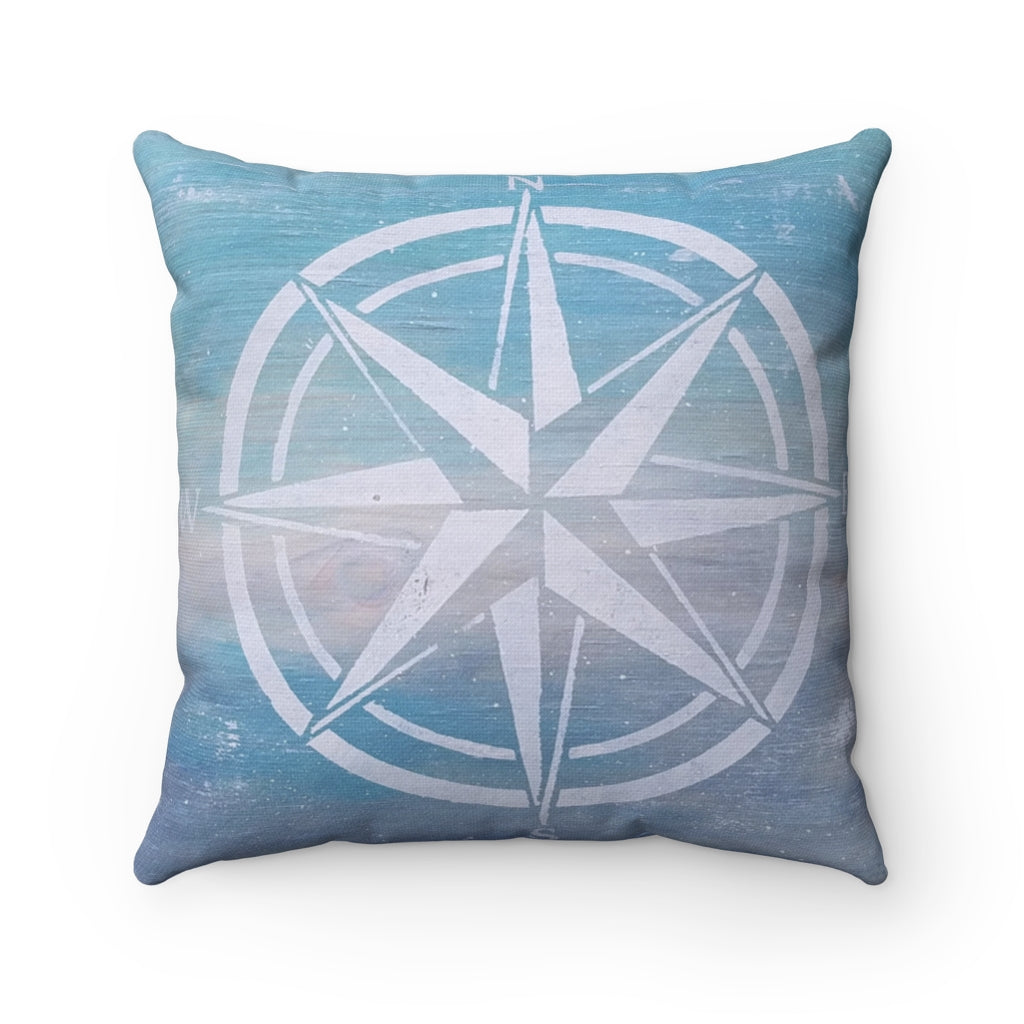 Nautical compass on sky and water blue background 16 inch Spun Polyester Square Pillow