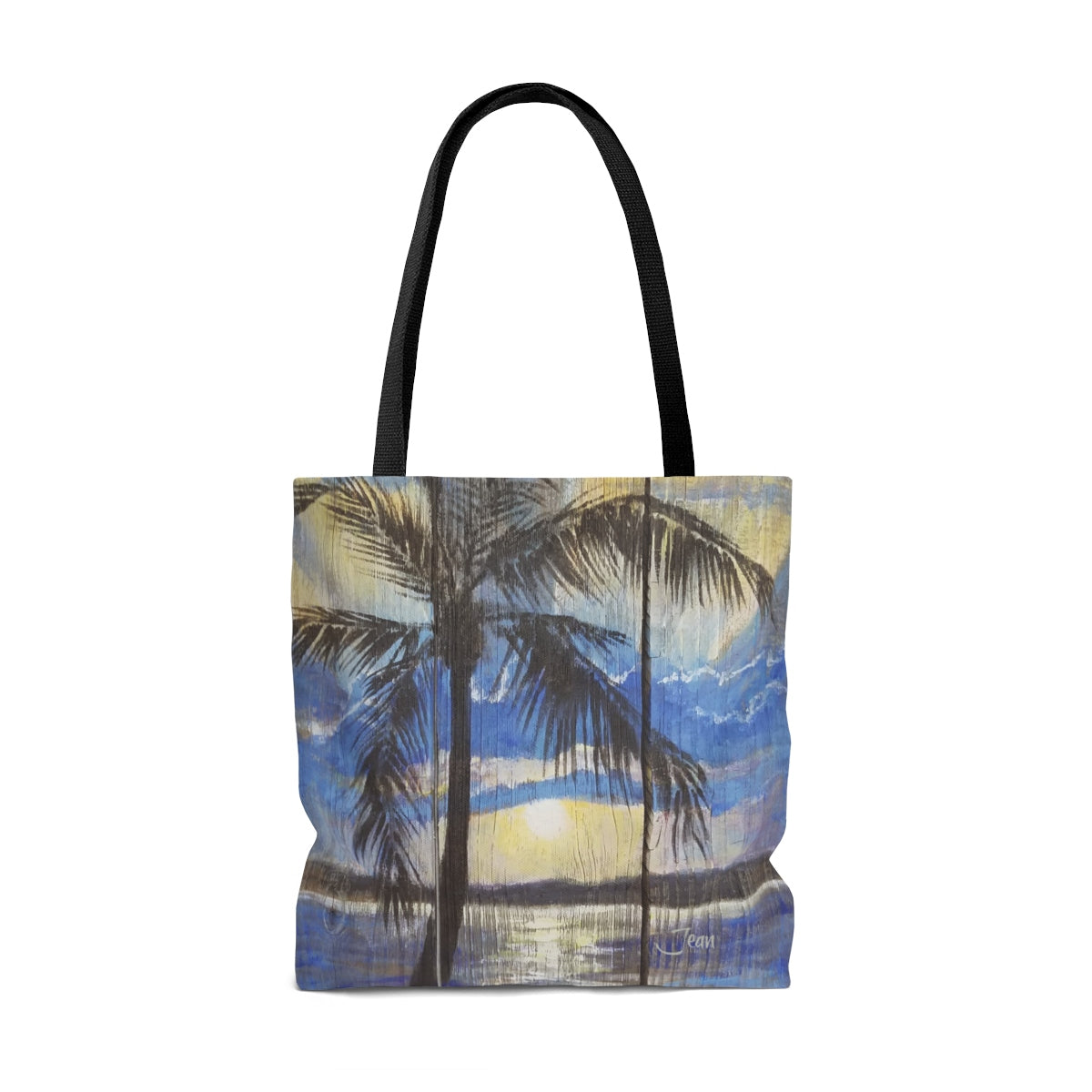 Sunrise with Palm tree and rays of sun thru blue clouds painting on Tote Bag